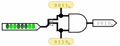 例如,假设我们需要一个电路来计算其八位输入的两个半字节(高四位和低四位)的按位与。 我们将有一个来自输入引脚的八位值,我们希望将其拆分为两个四位值。 在下面的电路中,我们使用分线器来完成此操作:8 位输入进入分线器,它将 8 位分成两个 4 位值,然后将其输入与门并从那里到输出 。