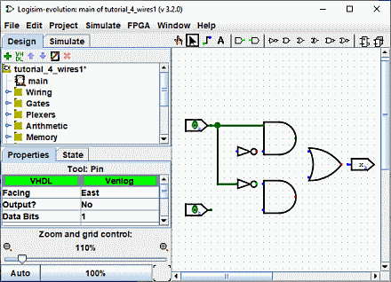 Logisim-evolution中的导线必须是水平或垂直的。 然后,为了将上部输入连接到非门和与门,我添加了三根不同的导线。