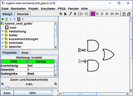 ), und platzieren das OR-Gatter in der Schaltung. Und dann setzen Sie die zwei Inverter vor den AND-Gattern mit dem "Inverter"-Werkzeug (