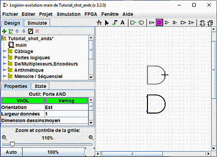 Je suggère de construire le circuit en insérant d'abord les portes logiques comme sorte de charpente et de les connecter ensuite avec des câbles. La première chose que nous allons faire c'est d'ajouter deux portes AND (portes ET). Cliquez sur l'outil "AND" dans la barre d'outils (
